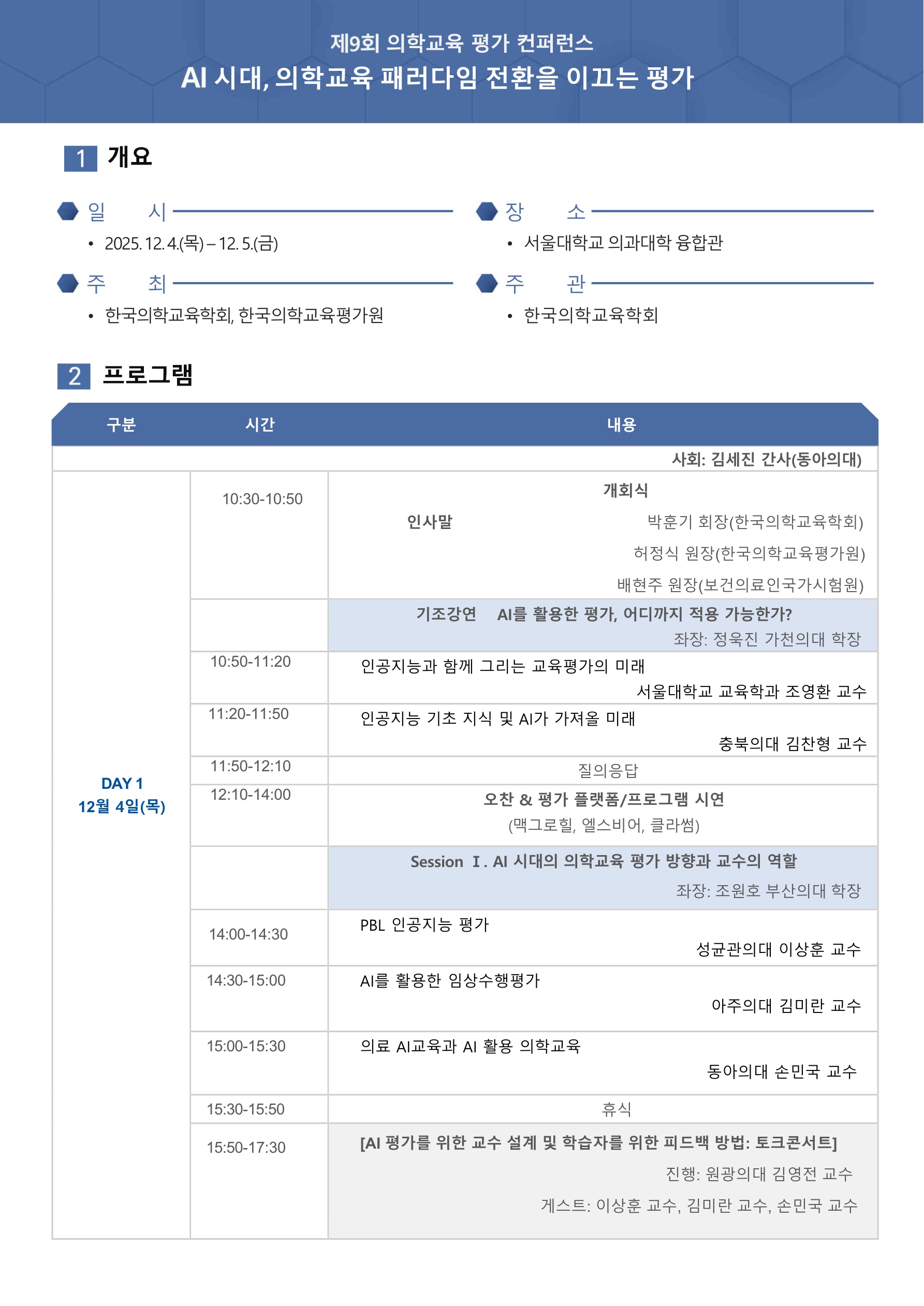 1. 행 사 명: 2025년도 제9회 의학교육 평가 컨퍼런스 2. 일 시: 2025년 12월 4일(목) ~ 5일(금) <2일간> 3. 장 소: 서울대학교 의과대학 융합관 4. 주 제: AI 시대, 의학교육 패러다임 전환을 이끄는 평가 5. 프로그램: 의학교육 평가 컨퍼런스, 기관주관 워크숍 6. 등 록: 사전등록 바로가기 (2025년 11월 9일(일)까지 7. 등 록 비: 컨퍼런스 - 180,000원 / 기관주관 워크숍 - 80,000원 / 컨퍼런스+기관주관 워크숍 - 250,000원 8. 홈페이지: 바로가기 9. 공동주최: 한국의학교육학회, 한국의학교육평가원 10. 주 관: 한국의학교육학회 11. 문 의: 한국의학교육학회 사무국 (02-741-6206, master@ksmed.or.kr)