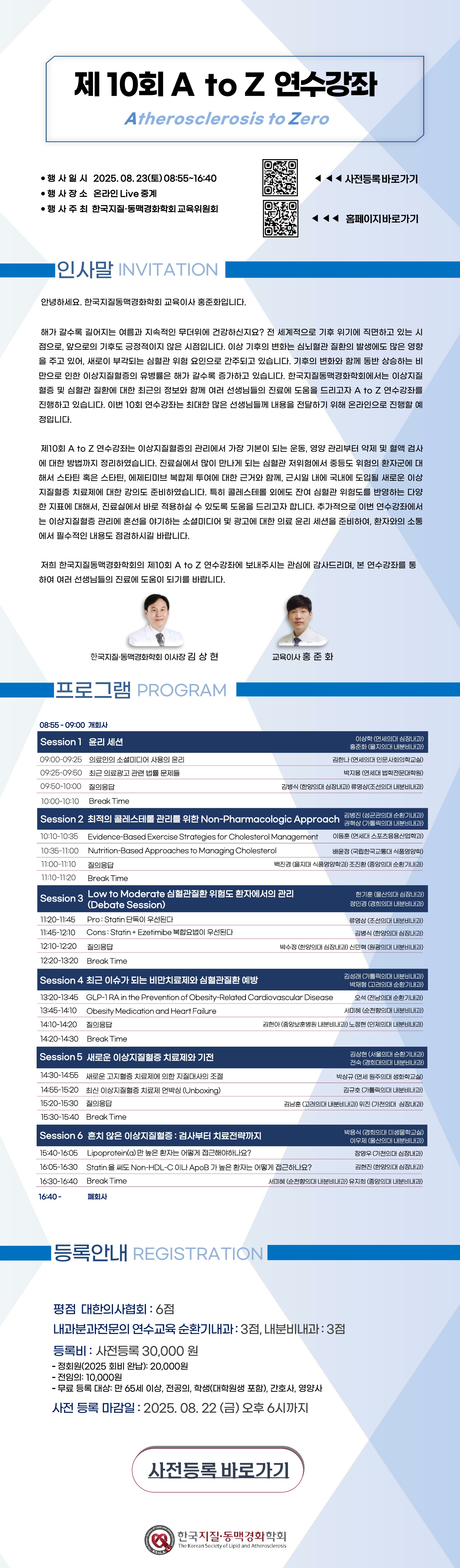 1. 행 사 명: 제10회 A to Z (Atherosclerosis to Zero) 연수강좌 2. 일 시: 2025년 8월 23일(토), 8:55 ~ 16:40 3. 장 소: 온라인 4. 등 록: 사전등록 바로가기 (2025년 8월 22일(금)까지) 5. 등 록 비: 무료 6. 홈페이지: 바로가기 7. 주 최: 한국지질·동맹경화학회 교육위원회 8. 평 점: 대한의사협회 6점 내과분과전문의 연수교육: 순환기내과 3점 / 내분비내과 3점 9. 문 의: 준비 사무국 (031-989-0217, info_jpartners@jmnews.co.kr)