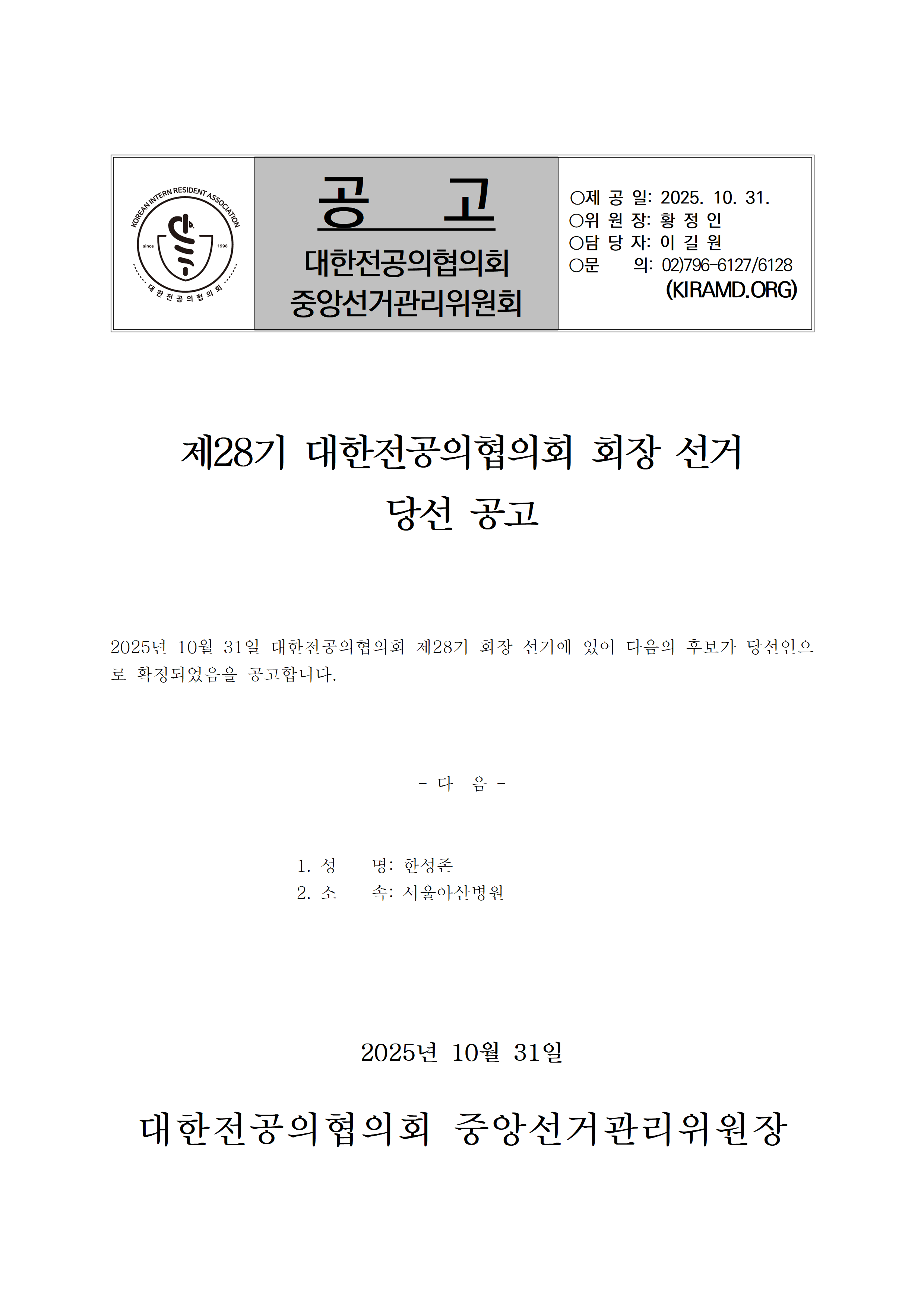 [중선관위] 제28기 대한전공의협의회 회장 선거 당선 공고